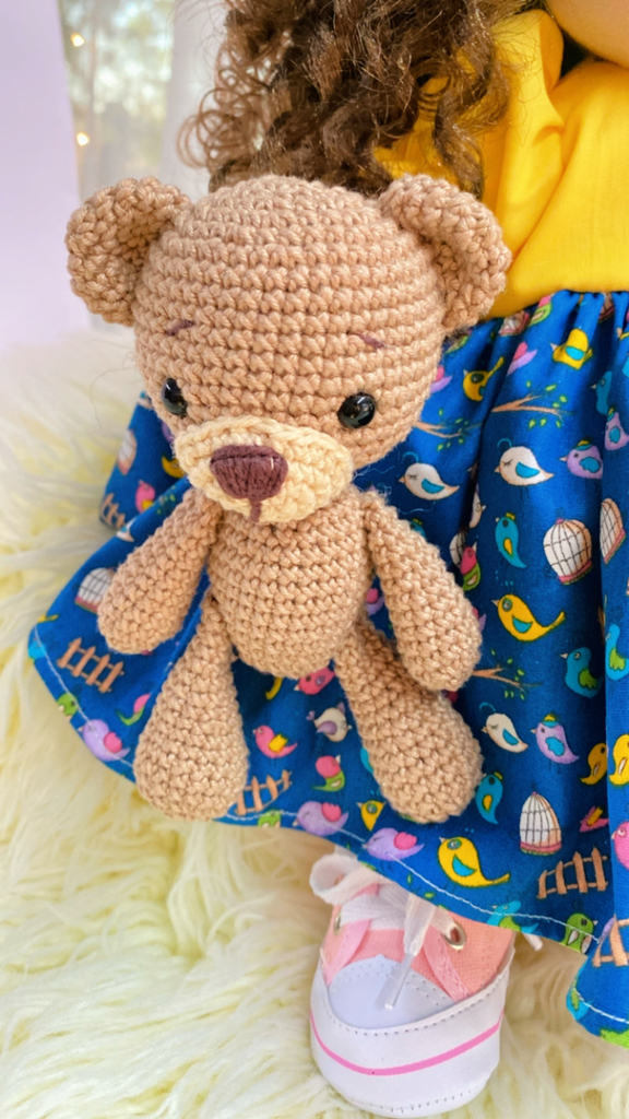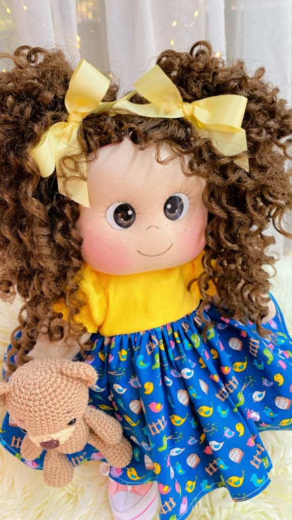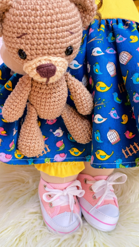 Esta é a encantadora Boneca de Pano Bella, uma obra de arte em forma de brinquedo. Com cabelos sintéticos cacheados marrons, olhos castanhos escuros e um vestido alegre de passarinhos, Bella transmite alegria e felicidade. Ela segura um lindo ursinho em amigurumi em sua mãozinha. Presentear alguém com a Boneca de Pano Bella é oferecer um tesouro cheio de amor e encanto, uma companheira inseparável em jornadas imaginativas.