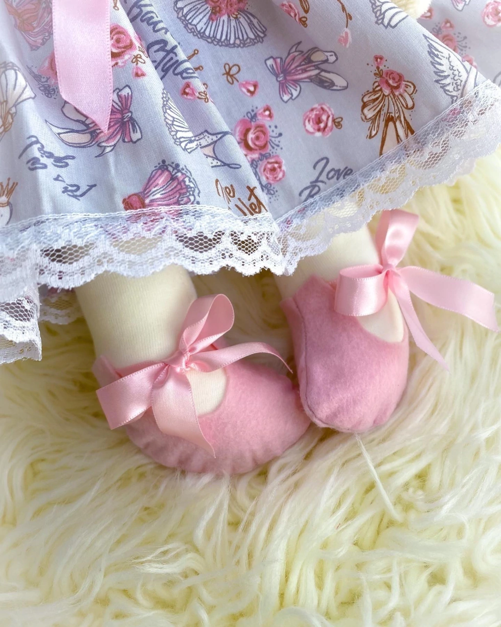 A boneca Dani é confeccionada em tecidos de algodão, cabelos em lã e enchimento em fibra siliconada antialérgica.