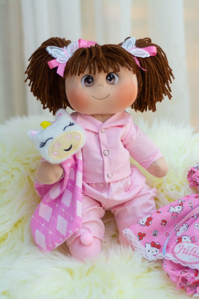 A boneca Júlia mede 35 centímetros, é articulada e macia. Confeccionada em tecidos de algodão, cabelos em lã e enchimento em fibra siliconada antialérgica.