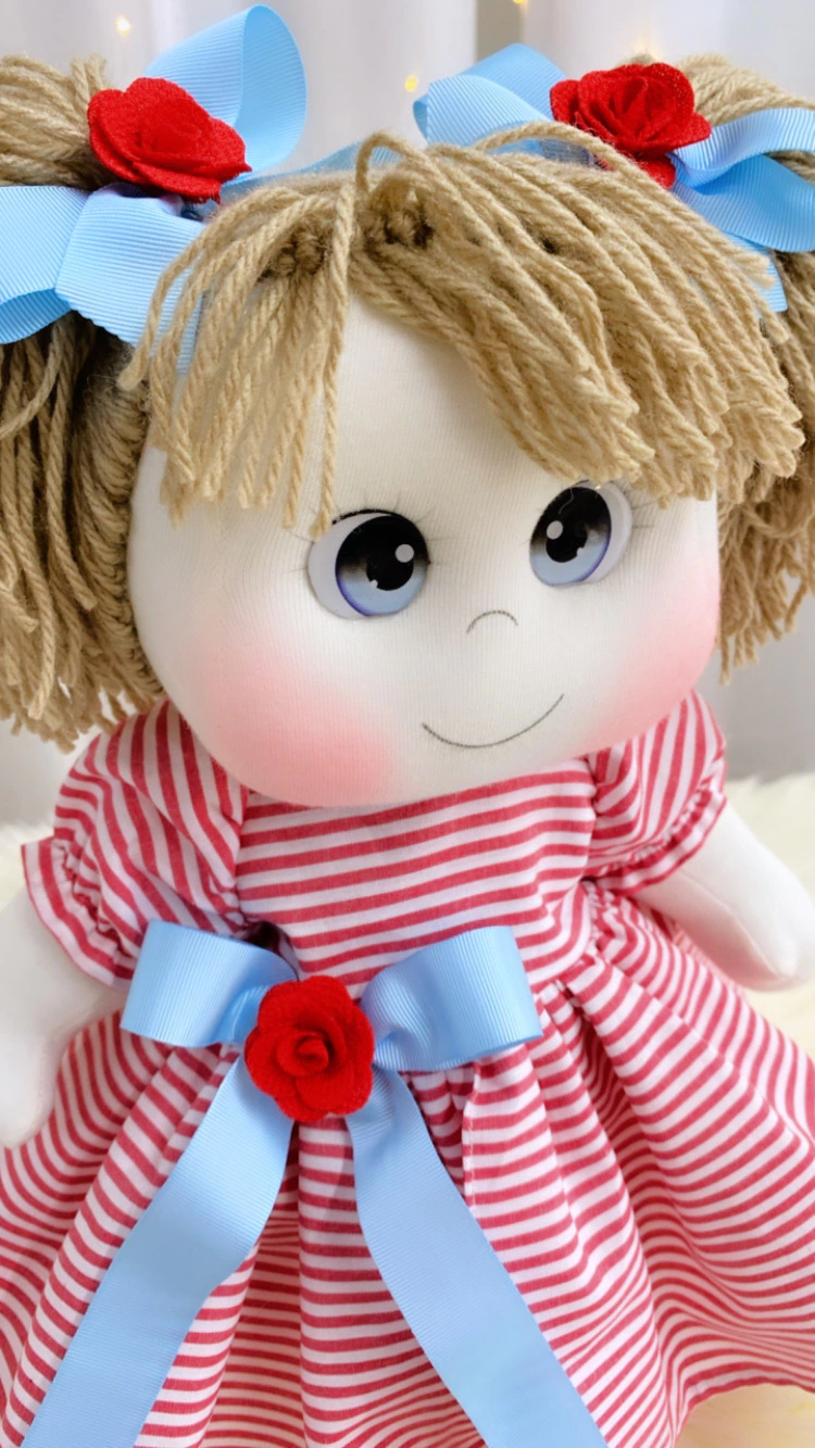 Esta bonequinha adorável está vestida com um charmoso vestido listrado nas cores vermelho e branco, complementado por laços azuis que conferem um toque de elegância. Seu penteado característico de maria-chiquinhas, junto com sua pele clara e olhos azuis brilhantes, tornam-na uma verdadeira boneca de conto de fadas.