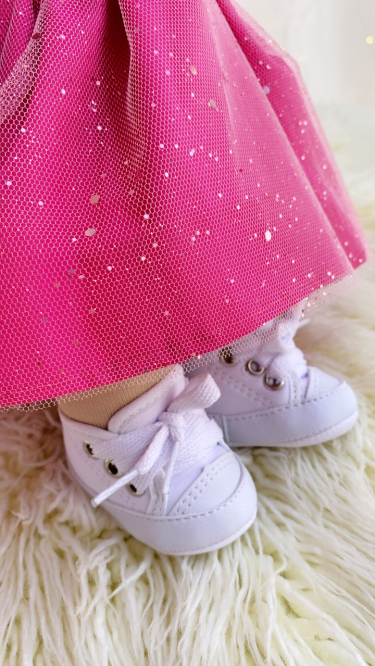 Ela vem vestida com um deslumbrante vestido pink com brilho e exibe tênis estilosos, prontos para acompanhar cada brincadeira. O charme da Pietra não para por aí! Você pode personalizar sua boneca bordando o nome de sua escolha, tornando-a ainda mais especial e única.