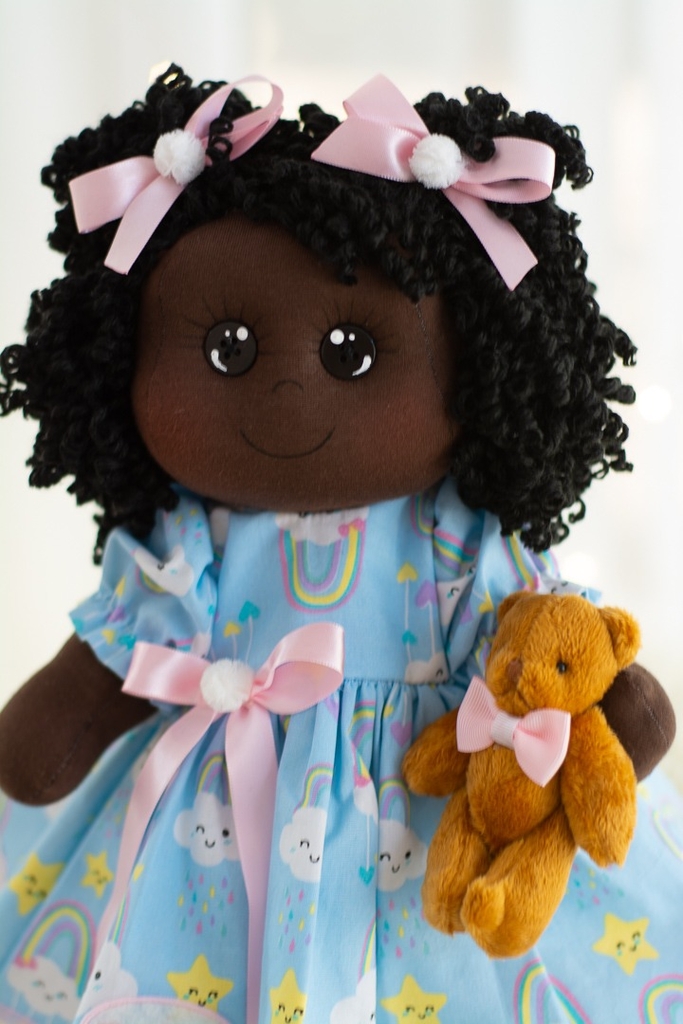 A boneca Rafaela mede 35 centímetros, é articulada e macia. Confeccionada em tecidos de algodão, cabelos em lã com modelagem definiva e enchimento antialérgico.