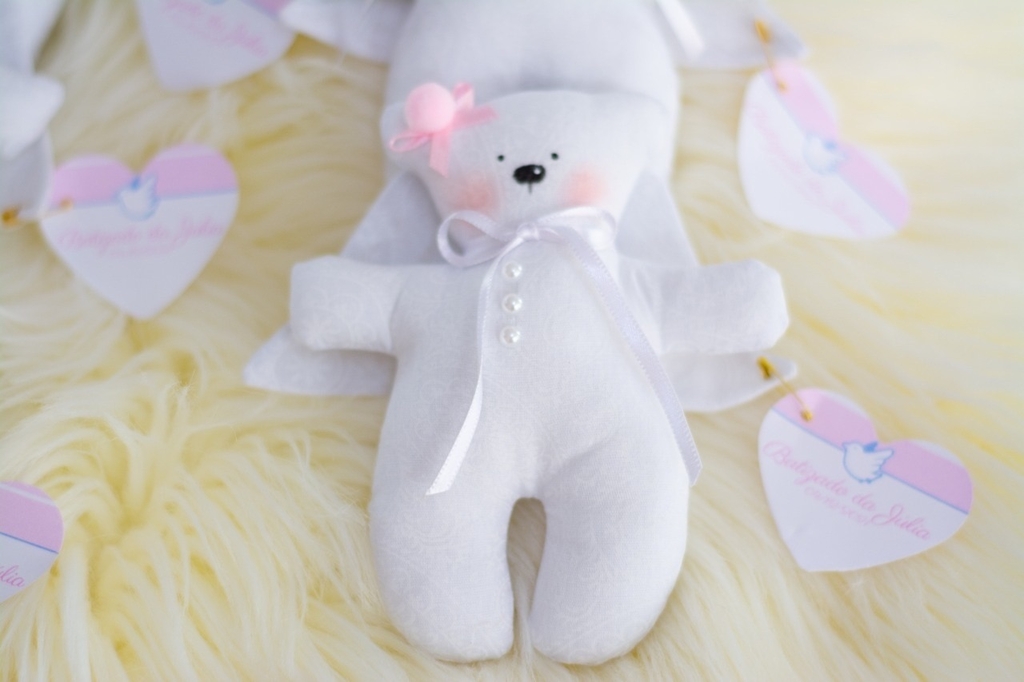 As lembrancinhas anjos ursinhos medem 13 centímetros, são confeccionados em tricoline com enchimento em fibra siliconada anti alérgica e são perfumadas com essência suave Rosa e romã.